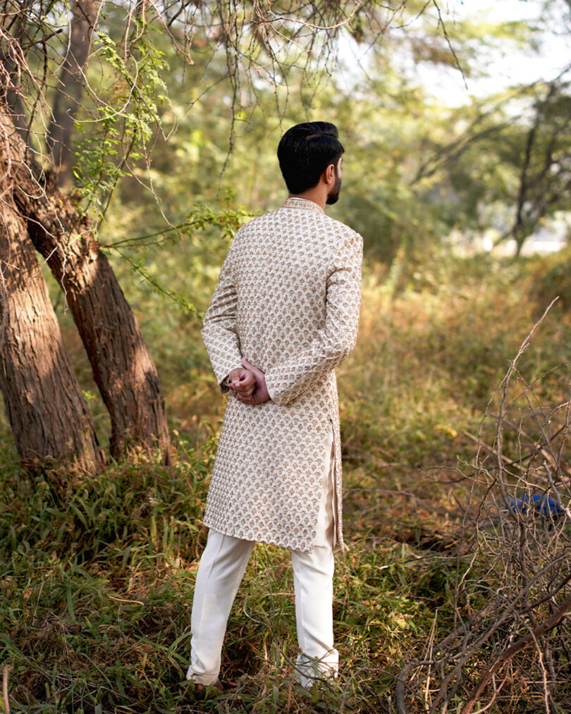 Description: Embodying opulence, Dahab radiates sophistication. Cut from pure Karandi, the sherwani dazzles with moti and kora detailing in a jewel toned golden. Paired with korean raw silk kurta and trousers, this ensemble is the perfect choice for your special occasions.