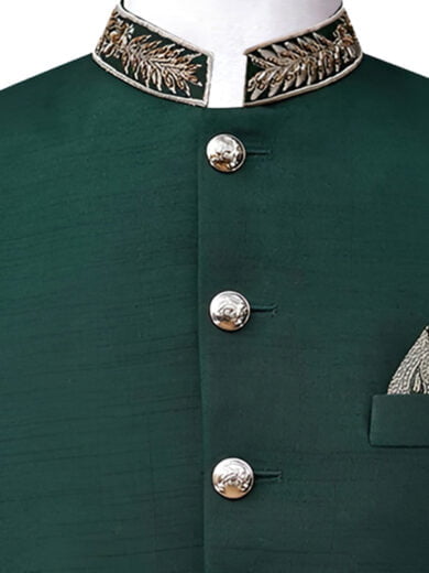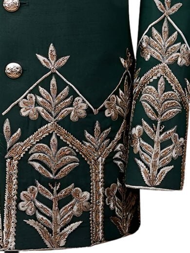 Introducing our stunning “Regal Emerald: Deep Green Prince Coat with Golden Embellishment.” This coat is the epitome of luxury and sophistication, designed to make you look and feel like royalty. Here’s why you’ll love it: