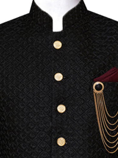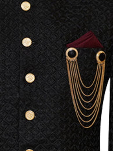 Elevate Your Style With This Exquisite Black Prince Coat, Designed To Captivate Attention Both Locally And Abroad. Crafted From Top-tier Materials, This Coat Exudes Longevity And Sophistication. Meticulously Fashioned Golden Brass Buttons And Chain Brooches Add A Touch Of Opulence, Complemented By A Striking Maroon Tie For A Burst Of Color. Whether Gracing A Formal Affair Or Commanding Attention On A Night Out, This Coat Epitomizes Class And Charm.